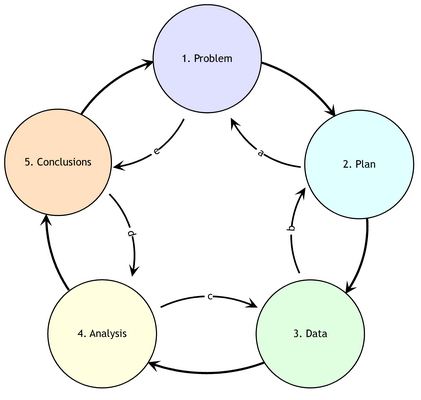 Another useful and a bit more generic analytical framework is to think the methodological work as a sequence of 5 steps that is called as PPDAC consisting of Problem, Plan, Data, Analysis, Conclusions [1]: